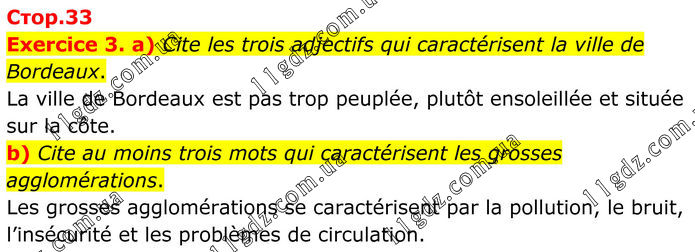 Exercice 3. a) Cite les trois adjectifs qui caractérisent la ville de Bordeaux. La ville de Bordeaux est pas trop peuplée, plutôt ensoleillée et située sur la côte. b) Cite au moins trois mots qui caractérisent les grosses agglomérations. Les grosses agglomérations se caractérisent par la pollution, le bruit, l’insécurité et les problèmes de circulation.