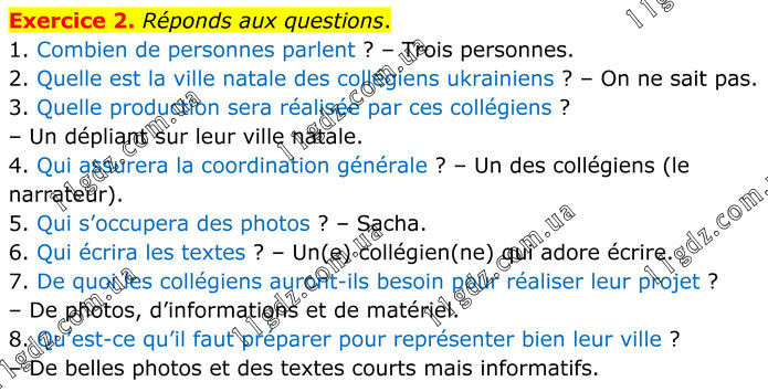 Exercice 2. Réponds aux questions. 1. Combien de personnes parlent ? – Trois personnes. 2. Quelle est la ville natale des collégiens ukrainiens ? – On ne sait pas. 3. Quelle production sera réalisée par ces collégiens ? – Un dépliant sur leur ville natale. 4. Qui assurera la coordination générale ? – Un des collégiens (le narrateur). 5. Qui s’occupera des photos ? – Sacha. 6. Qui écrira les textes ? – Un(e) collégien(ne) qui adore écrire. 7. De quoi les collégiens auront-ils besoin pour réaliser leur projet ? – De photos, d’informations et de matériel. 8. Qu’est-ce qu’il faut préparer pour représenter bien leur ville ? – De belles photos et des textes courts mais informatifs.