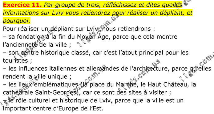 Exercice 11. Par groupe de trois, réfléchissez et dites quelles informations sur Lviv vous retiendrez pour réaliser un dépliant, et pourquoi. Pour réaliser un dépliant sur Lviv, nous retiendrons : – sa fondation à la fin du Moyen Âge, parce que cela montre l’ancienneté de la ville ; – son centre historique classé, car c’est l’atout principal pour les touristes ; – les influences italiennes et allemandes de l’architecture, parce qu’elles rendent la ville unique ; – les lieux emblématiques (la place du Marché, le Haut Château, la cathédrale Saint-Georges), car ce sont des sites à visiter ; – le rôle culturel et historique de Lviv, parce que la ville est un important centre d’Europe de l’Est.