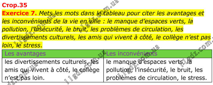 Exercice 7. Mets les mots dans le tableau pour citer les avantages et les inconvénients de la vie en ville : le manque d’espaces verts, la pollution, l’insécurité, le bruit, les problèmes de circulation, les divertissements culturels, les amis qui vivent à côté, le collège n’est pas loin, le stress. Les avantages Les inconvénients les divertissements culturels, les amis qui vivent à côté, le collège n’est pas loin. le manque d’espaces verts, la pollution, l’insécurité, le bruit, les problèmes de circulation, le stress.