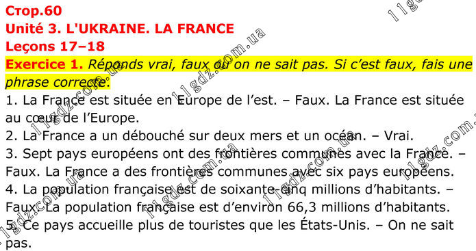 Unité 3. L'UKRAINE. LA FRANCE Leçons 17–18 Exercice 1. Réponds vrai, faux ou on ne sait pas. Si c’est faux, fais une phrase correcte. 1. La France est située en Europe de l’est. – Faux. La France est située au cœur de l’Europe. 2. La France a un débouché sur deux mers et un océan. – Vrai. 3. Sept pays européens ont des frontières communes avec la France. – Faux. La France a des frontières communes avec six pays européens. 4. La population française est de soixante-cinq millions d’habitants. – Faux. La population française est d’environ 66,3 millions d’habitants. 5. Ce pays accueille plus de touristes que les États-Unis. – On ne sait pas.