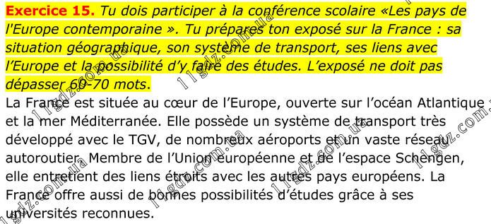 Exercice 15. Tu dois participer à la conférence scolaire «Les pays de l'Europe contemporaine ». Tu prépares ton exposé sur la France : sa situation géographique, son système de transport, ses liens avec l’Europe et la possibilité d’y faire des études. L’exposé ne doit pas dépasser 60-70 mots. La France est située au cœur de l’Europe, ouverte sur l’océan Atlantique et la mer Méditerranée. Elle possède un système de transport très développé avec le TGV, de nombreux aéroports et un vaste réseau autoroutier. Membre de l’Union européenne et de l’espace Schengen, elle entretient des liens étroits avec les autres pays européens. La France offre aussi de bonnes possibilités d’études grâce à ses universités reconnues.