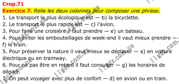 Exercice 7. Relie les deux colonnes pour composer une phrase. 1. Le transport le plus écologique est — b) la bicyclette. 2. Le transport le plus rapide est — c) l’avion. 3. Pour faire une croisière il faut prendre — e) un bateau. 4. Pour éviter les embouteillages de week-end il vaut mieux prendre — f) le train. 5. Pour préserver la nature il vaut mieux se déplacer — a) en voiture électrique ou en tramway. 6. Pour ne pas être en retard il faut consulter — g) les horaires de départ. 7. On peut voyager avec plus de confort — d) en avion ou en train.