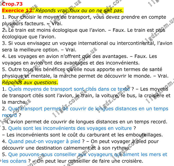 Exercice 12. Réponds vrai, faux ou on ne sait pas. 1. Pour choisir le moyen de transport, vous devez prendre en compte plusieurs facteurs. – Vrai. 2. Le train est moins écologique que l’avion. – Faux. Le train est plus écologique que l’avion. 3. Si vous envisagez un voyage international ou intercontinental, l’avion sera la meilleure option. – Vrai. 4. Les voyages en avion n’offrent que des avantages. – Faux. Les voyages en avion ont des avantages et des inconvénients. 5. Outre tous les bénéfices qu’elle nous apporte en termes de santé physique et mentale, la marche permet de découvrir le monde. – Vrai. Réponds aux questions. 1. Quels moyens de transport sont cités dans ce texte ? – Les moyens de transport cités sont l’avion, le train, la voiture, le bus, la croisière et la marche. 2. Quel transport permet de couvrir de longues distances en un temps record ? – L’avion permet de couvrir de longues distances en un temps record. 3. Quels sont les inconvénients des voyages en voiture ? – Les inconvénients sont le coût du carburant et les embouteillages. 4. Quand peut-on voyager à pied ? – On peut voyager à pied pour découvrir une destination calmement et à son rythme. 5. Que pouvons-nous conseiller aux voyageurs qui aiment les mers et les océans ? – On peut leur conseiller de faire une croisière.