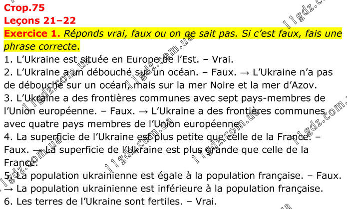 Leçons 21–22 Exercice 1. Réponds vrai, faux ou on ne sait pas. Si c’est faux, fais une phrase correcte. 1. L’Ukraine est située en Europe de l’Est. – Vrai. 2. L’Ukraine a un débouché sur un océan. – Faux. → L’Ukraine n’a pas de débouché sur un océan, mais sur la mer Noire et la mer d’Azov. 3. L’Ukraine a des frontières communes avec sept pays-membres de l’Union européenne. – Faux. → L’Ukraine a des frontières communes avec quatre pays membres de l’Union européenne. 4. La superficie de l’Ukraine est plus petite que celle de la France. – Faux. → La superficie de l’Ukraine est plus grande que celle de la France. 5. La population ukrainienne est égale à la population française. – Faux. → La population ukrainienne est inférieure à la population française. 6. Les terres de l’Ukraine sont fertiles. – Vrai.