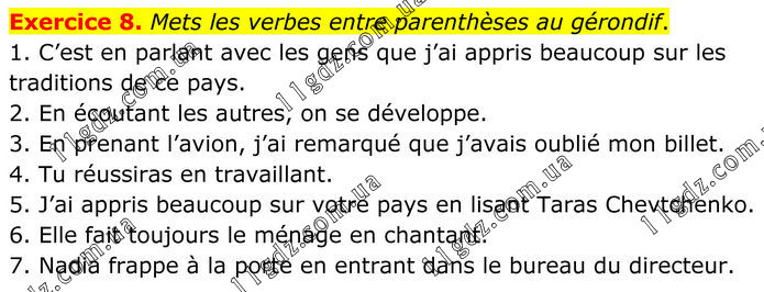 Exercice 8. Mets les verbes entre parenthèses au gérondif. 1. C’est en parlant avec les gens que j’ai appris beaucoup sur les traditions de ce pays. 2. En écoutant les autres, on se développe. 3. En prenant l’avion, j’ai remarqué que j’avais oublié mon billet. 4. Tu réussiras en travaillant. 5. J’ai appris beaucoup sur votre pays en lisant Taras Chevtchenko. 6. Elle fait toujours le ménage en chantant. 7. Nadia frappe à la porte en entrant dans le bureau du directeur.