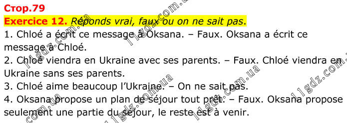 Exercice 12. Réponds vrai, faux ou on ne sait pas. 1. Chloé a écrit ce message à Oksana. – Faux. Oksana a écrit ce message à Chloé. 2. Chloé viendra en Ukraine avec ses parents. – Faux. Chloé viendra en Ukraine sans ses parents. 3. Chloé aime beaucoup l’Ukraine. – On ne sait pas. 4. Oksana propose un plan de séjour tout prêt. – Faux. Oksana propose seulement une partie du séjour, le reste est à venir.