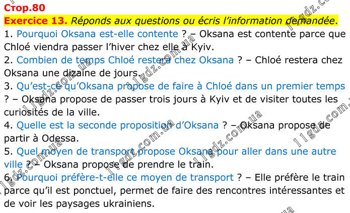 Exercice 13. Réponds aux questions ou écris l’information demandée. 1. Pourquoi Oksana est-elle contente ? – Oksana est contente parce que Chloé viendra passer l’hiver chez elle à Kyiv. 2. Combien de temps Chloé restera chez Oksana ? – Chloé restera chez Oksana une dizaine de jours. 3. Qu’est-ce qu’Oksana propose de faire à Chloé dans un premier temps ? – Oksana propose de passer trois jours à Kyiv et de visiter toutes les curiosités de la ville. 4. Quelle est la seconde proposition d’Oksana ? – Oksana propose de partir à Odessa. 5. Quel moyen de transport propose Oksana pour aller dans une autre ville ? – Oksana propose de prendre le train. 6. Pourquoi préfère-t-elle ce moyen de transport ? – Elle préfère le train parce qu’il est ponctuel, permet de faire des rencontres intéressantes et de voir les paysages ukrainiens.