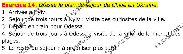 Exercice 14. Dresse le plan de séjour de Chloé en Ukraine. 1. Arrivée à Kyiv. 2. Séjour de trois jours à Kyiv : visite des curiosités de la ville. 3. Départ en train pour Odessa. 4. Séjour de trois jours à Odessa : visite de la ville, de la mer et des plages. 5. Le reste du séjour : à organiser plus tard.