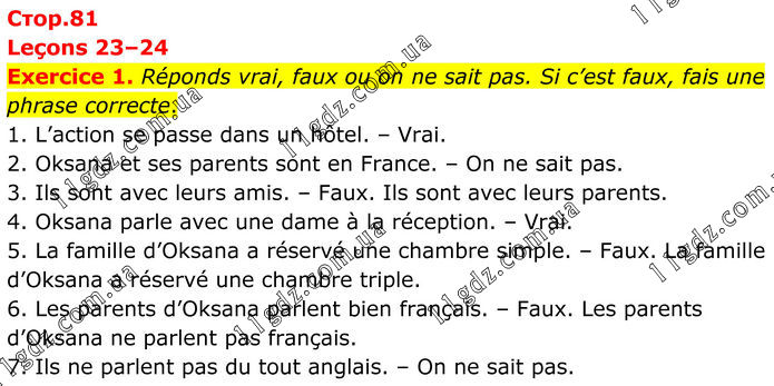 Leçons 23–24 Exercice 1. Réponds vrai, faux ou on ne sait pas. Si c’est faux, fais une phrase correcte. 1. L’action se passe dans un hôtel. – Vrai. 2. Oksana et ses parents sont en France. – On ne sait pas. 3. Ils sont avec leurs amis. – Faux. Ils sont avec leurs parents. 4. Oksana parle avec une dame à la réception. – Vrai. 5. La famille d’Oksana a réservé une chambre simple. – Faux. La famille d’Oksana a réservé une chambre triple. 6. Les parents d’Oksana parlent bien français. – Faux. Les parents d’Oksana ne parlent pas français. 7. Ils ne parlent pas du tout anglais. – On ne sait pas.