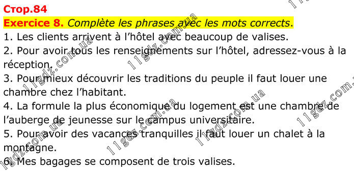 Exercice 8. Complète les phrases avec les mots corrects. 1. Les clients arrivent à l’hôtel avec beaucoup de valises. 2. Pour avoir tous les renseignements sur l’hôtel, adressez-vous à la réception. 3. Pour mieux découvrir les traditions du peuple il faut louer une chambre chez l’habitant. 4. La formule la plus économique du logement est une chambre de l’auberge de jeunesse sur le campus universitaire. 5. Pour avoir des vacances tranquilles il faut louer un chalet à la montagne. 6. Mes bagages se composent de trois valises.