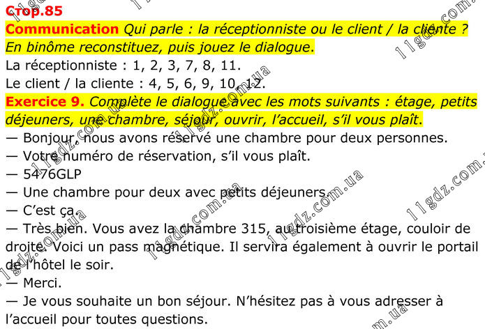 Communication Qui parle : la réceptionniste ou le client / la cliente ? En binôme reconstituez, puis jouez le dialogue. La réceptionniste : 1, 2, 3, 7, 8, 11. Le client / la cliente : 4, 5, 6, 9, 10, 12. Exercice 9. Complète le dialogue avec les mots suivants : étage, petits déjeuners, une chambre, séjour, ouvrir, l’accueil, s’il vous plaît. — Bonjour, nous avons réservé une chambre pour deux personnes. — Votre numéro de réservation, s’il vous plaît. — 5476GLP — Une chambre pour deux avec petits déjeuners. — C’est ça. — Très bien. Vous avez la chambre 315, au troisième étage, couloir de droite. Voici un pass magnétique. Il servira également à ouvrir le portail de l’hôtel le soir. — Merci. — Je vous souhaite un bon séjour. N’hésitez pas à vous adresser à l’accueil pour toutes questions.