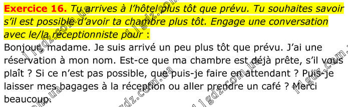 Exercice 16. Tu arrives à l’hôtel plus tôt que prévu. Tu souhaites savoir s’il est possible d’avoir ta chambre plus tôt. Engage une conversation avec le/la réceptionniste pour : Bonjour, madame. Je suis arrivé un peu plus tôt que prévu. J’ai une réservation à mon nom. Est-ce que ma chambre est déjà prête, s’il vous plaît ? Si ce n’est pas possible, que puis-je faire en attendant ? Puis-je laisser mes bagages à la réception ou aller prendre un café ? Merci beaucoup.