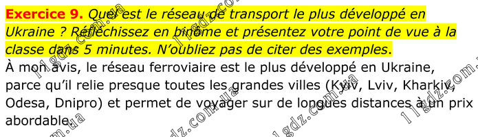 Exercice 9. Quel est le réseau de transport le plus développé en Ukraine ? Réfléchissez en binôme et présentez votre point de vue à la classe dans 5 minutes. N’oubliez pas de citer des exemples. À mon avis, le réseau ferroviaire est le plus développé en Ukraine, parce qu’il relie presque toutes les grandes villes (Kyiv, Lviv, Kharkiv, Odesa, Dnipro) et permet de voyager sur de longues distances à un prix abordable.