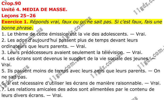 Unité 4. MEDIA DE MASSE. Leçons 25–26 Exercice 1. Réponds vrai, faux ou on ne sait pas. Si c’est faux, fais une bonne phrase. 1. Le thème de cette émission est la vie des adolescents. — Vrai. 2. Les ados d’aujourd’hui passent plus de temps devant leurs ordinateurs que leurs parents. — Vrai. 3. Leurs prédécesseurs avaient seulement la télévision. — Vrai. 4. Les écrans sont devenus le support de la vie sociale des jeunes. — Vrai. 5. Ils passent moins de temps avec leurs amis que leurs parents. — On ne sait pas. 6. Il est nécessaire d’utiliser les écrans de manière raisonnable. — Vrai. 7. Les relations amicales des ados sont alimentées par le contenu de leurs divers écrans. — Vrai.