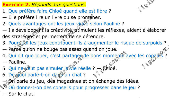 Exercice 2. Réponds aux questions. 1. Que préfère faire Chloé quand elle est libre ? — Elle préfère lire un livre ou se promener. 2. Quels avantages ont les jeux vidéo selon Pauline ? — Ils développent la créativité, stimulent les réflexes, aident à élaborer des stratégies et permettent de se détendre. 3. Pourquoi les jeux contribuent-ils à augmenter le risque de surpoids ? — Parce qu’on ne bouge pas assez quand on joue. 4. Qui dit que jouer, c’est partager de bons moments avec les copains ? — Pauline. 5. Qui ne veut pas simuler la vie réelle ? — Chloé. 6. De quoi parle-t-on dans un chat ? — On parle du jeu, des magazines et on échange des idées. 7. Où donne-t-on des conseils pour progresser dans le jeu ? — Sur le chat.