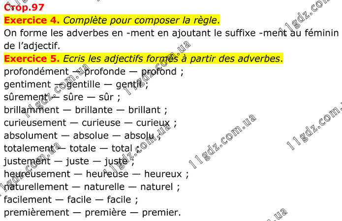 Exercice 4. Complète pour composer la règle. On forme les adverbes en -ment en ajoutant le suffixe -ment au féminin de l’adjectif. Exercice 5. Ecris les adjectifs formés à partir des adverbes. profondément — profonde — profond ; gentiment — gentille — gentil ; sûrement — sûre — sûr ; brillamment — brillante — brillant ; curieusement — curieuse — curieux ; absolument — absolue — absolu ; totalement — totale — total ; justement — juste — juste ; heureusement — heureuse — heureux ; naturellement — naturelle — naturel ; facilement — facile — facile ; premièrement — première — premier.