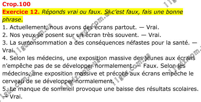 Exercice 12. Réponds vrai ou faux. Si c’est faux, fais une bonne phrase. 1. Actuellement, nous avons des écrans partout. — Vrai. 2. Nos yeux se posent sur un écran très souvent. — Vrai. 3. La surconsommation a des conséquences néfastes pour la santé. — Vrai. 4. Selon les médecins, une exposition massive des jeunes aux écrans n’empêche pas de se développer normalement. — Faux. Selon les médecins, une exposition massive et précoce aux écrans empêche le cerveau de se développer normalement. 5. Le manque de sommeil provoque une baisse des résultats scolaires. — Vrai.
