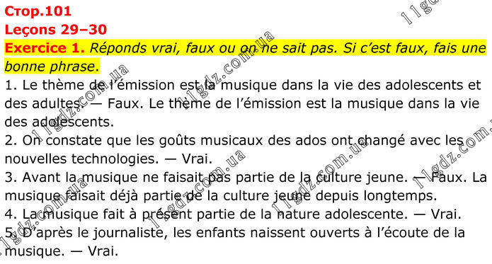 Leçons 29–30 Exercice 1. Réponds vrai, faux ou on ne sait pas. Si c’est faux, fais une bonne phrase. 1. Le thème de l’émission est la musique dans la vie des adolescents et des adultes. — Faux. Le thème de l’émission est la musique dans la vie des adolescents. 2. On constate que les goûts musicaux des ados ont changé avec les nouvelles technologies. — Vrai. 3. Avant la musique ne faisait pas partie de la culture jeune. — Faux. La musique faisait déjà partie de la culture jeune depuis longtemps. 4. La musique fait à présent partie de la nature adolescente. — Vrai. 5. D’après le journaliste, les enfants naissent ouverts à l’écoute de la musique. — Vrai.
