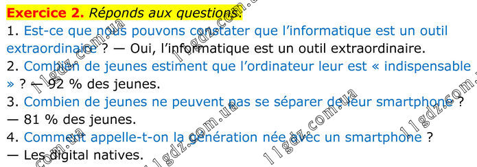 Exercice 2. Réponds aux questions. 1. Est-ce que nous pouvons constater que l’informatique est un outil extraordinaire ? — Oui, l’informatique est un outil extraordinaire. 2. Combien de jeunes estiment que l’ordinateur leur est « indispensable » ? — 92 % des jeunes. 3. Combien de jeunes ne peuvent pas se séparer de leur smartphone ? — 81 % des jeunes. 4. Comment appelle-t-on la génération née avec un smartphone ? — Les digital natives.