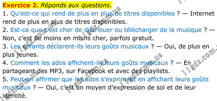 Exercice 2. Réponds aux questions. 1. Qu’est-ce qui rend de plus en plus de titres disponibles ? — Internet rend de plus en plus de titres disponibles. 2. Est-ce que c’est cher de distribuer ou télécharger de la musique ? — Non, c’est de moins en moins cher, parfois gratuit. 3. Les enfants déclarent-ils leurs goûts musicaux ? — Oui, de plus en plus jeunes. 4. Comment les ados affichent-ils leurs goûts musicaux ? — En partageant des MP3, sur Facebook et avec des playlists. 5. Peut-on affirmer que les ados s’expriment en affichant leurs goûts musicaux ? — Oui, c’est un moyen d’expression de soi et de leur identité.