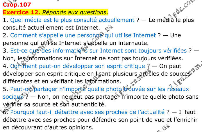 Exercice 12. Réponds aux questions. 1. Quel média est le plus consulté actuellement ? — Le média le plus consulté actuellement est Internet. 2. Comment s’appelle une personne qui utilise Internet ? — Une personne qui utilise Internet s’appelle un internaute. 3. Est-ce que des informations sur Internet sont toujours vérifiées ? — Non, les informations sur Internet ne sont pas toujours vérifiées. 4. Comment peut-on développer son esprit critique ? — On peut développer son esprit critique en lisant plusieurs articles de sources différentes et en vérifiant les informations. 5. Peut-on partager n’importe quelle photo trouvée sur les réseaux sociaux ? — Non, on ne peut pas partager n’importe quelle photo sans vérifier sa source et son authenticité. 6. Pourquoi faut-il débattre avec ses proches de l’actualité ? — Il faut débattre avec ses proches pour défendre son point de vue et l’enrichir en découvrant d’autres opinions.
