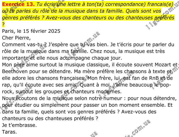Exercice 13. Tu écris une lettre à ton(ta) correspondance) francais(e) où tu parles du rôle de la musique dans ta famille. Quels sont vos genres préférés ? Avez-vous des chanteurs ou des chanteuses préférés ? Paris, le 15 février 2025 Cher Pierre, Comment vas-tu ? J’espère que tu vas bien. Je t’écris pour te parler du rôle de la musique dans ma famille. Chez nous, la musique est très importante et elle nous accompagne chaque jour. Mon père aime surtout la musique classique, il écoute souvent Mozart et Beethoven pour se détendre. Ma mère préfère les chansons à texte et elle adore les chansons françaises. Mon frère, lui, est fan de RnB et de rap, qu’il écoute avec ses amis. Quant à moi, j’aime beaucoup le pop-rock, surtout les groupes et chanteurs modernes. Nous écoutons de la musique selon notre humeur : pour nous détendre, pour étudier ou simplement pour passer un bon moment ensemble. Et dans ta famille, quels sont vos genres préférés ? Avez-vous des chanteurs ou des chanteuses préférés ? Je t’embrasse. Taras.