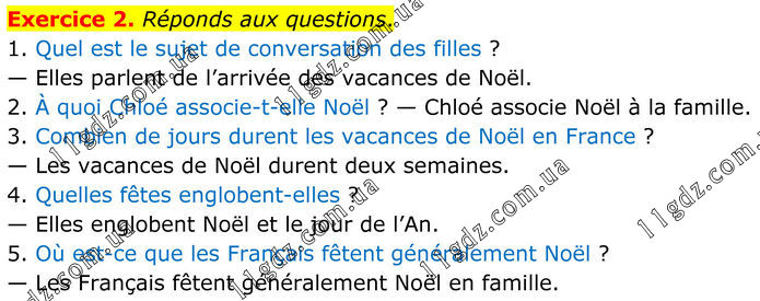 Exercice 2. Réponds aux questions. 1. Quel est le sujet de conversation des filles ? — Elles parlent de l’arrivée des vacances de Noël. 2. À quoi Chloé associe-t-elle Noël ? — Chloé associe Noël à la famille. 3. Combien de jours durent les vacances de Noël en France ? — Les vacances de Noël durent deux semaines. 4. Quelles fêtes englobent-elles ? — Elles englobent Noël et le jour de l’An. 5. Où est-ce que les Français fêtent généralement Noël ? — Les Français fêtent généralement Noël en famille.