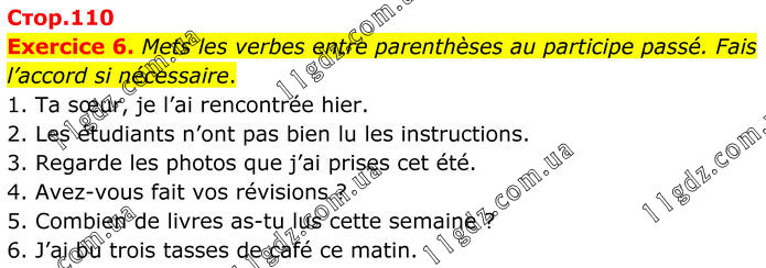 Exercice 6. Mets les verbes entre parenthèses au participe passé. Fais l’accord si nécessaire. 1. Ta sœur, je l’ai rencontrée hier. 2. Les étudiants n’ont pas bien lu les instructions. 3. Regarde les photos que j’ai prises cet été. 4. Avez-vous fait vos révisions ? 5. Combien de livres as-tu lus cette semaine ? 6. J’ai bu trois tasses de café ce matin.