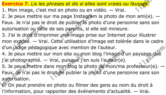 Exercice 7. Lis les phrases et dis si elles sont vraies ou fausses. 1. Mon image, c’est moi en photo ou en vidéo. — Vrai. 2. Je peux mettre sur ma page Instagram la photo de mon ami(e). — Faux. Je n’ai pas le droit de publier la photo d’une personne sans son autorisation ou celle de ses parents, si elle est mineure. 3. J’ai le droit d’imprimer une image prise sur Internet pour illustrer mon exposé. — Vrai. Cette utilisation d’image est tolérée dans le cadre d’un usage pédagogique avec mention de l’auteur. 4. Je peux mettre sur mon site ou mon blog l’image d’un paysage que j’ai photographié. — Vrai, puisque j’en suis l’auteur(e). 5. Je peux mettre dans mon blog la photo de mon/ma professeur(e). — Faux. Je n’ai pas le droit de publier la photo d’une personne sans son autorisation. 6. On peut prendre en photo ou filmer des gens au nom du droit à l’information, pour rapporter des événements d’actualité. — Vrai.