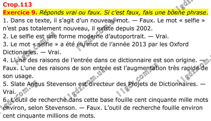 Exercice 9. Réponds vrai ou faux. Si c’est faux, fais une bonne phrase. 1. Dans ce texte, il s’agit d’un nouveau mot. — Faux. Le mot « selfie » n’est pas totalement nouveau, il existe depuis 2002. 2. Le selfie est une forme moderne d’autoportrait. — Vrai. 3. Le mot « selfie » a été élu mot de l’année 2013 par les Oxford Dictionaries. — Vrai. 4. L’une des raisons de l’entrée dans ce dictionnaire est son origine. — Faux. L’une des raisons de son entrée est l’augmentation très rapide de son usage. 5. Slate Angus Stevenson est directeur des Projets de Dictionnaires. — Vrai. 6. L’outil de recherche dans cette base fouille cent cinquante mille mots environ, selon Stevenson. — Faux. L’outil de recherche fouille environ cent cinquante millions de mots.