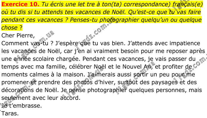 Exercice 10. Tu écris une let tre à ton(ta) correspondance) français(e) où tu dis si tu attends tes vacances de Noël. Qu’est-ce que tu vas faire pendant ces vacances ? Penses-tu photographier quelqu’un ou quelque chose ? Cher Pierre, Comment vas-tu ? J’espère que tu vas bien. J’attends avec impatience les vacances de Noël, car j’en ai vraiment besoin pour me reposer après une année scolaire chargée. Pendant ces vacances, je vais passer du temps avec ma famille, célébrer Noël et le Nouvel An, et profiter de moments calmes à la maison. J’aimerais aussi sortir un peu pour me promener et prendre des photos d’hiver, surtout des paysages et des décorations de Noël. Je pense photographier quelques personnes, mais seulement avec leur accord. Je t’embrasse. Taras.