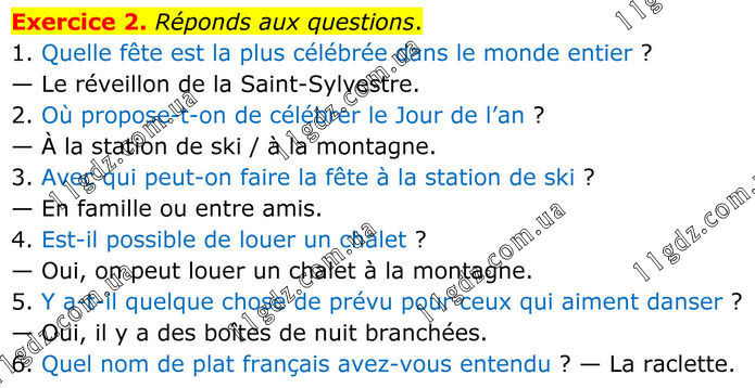Exercice 2. Réponds aux questions. 1. Quelle fête est la plus célébrée dans le monde entier ? — Le réveillon de la Saint-Sylvestre. 2. Où propose-t-on de célébrer le Jour de l’an ? — À la station de ski / à la montagne. 3. Avec qui peut-on faire la fête à la station de ski ? — En famille ou entre amis. 4. Est-il possible de louer un chalet ? — Oui, on peut louer un chalet à la montagne. 5. Y a-t-il quelque chose de prévu pour ceux qui aiment danser ? — Oui, il y a des boîtes de nuit branchées. 6. Quel nom de plat français avez-vous entendu ? — La raclette.