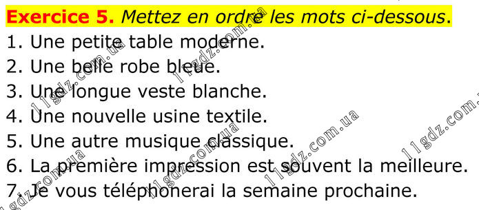 Exercice 5. Mettez en ordre les mots ci-dessous. 1. Une petite table moderne. 2. Une belle robe bleue. 3. Une longue veste blanche. 4. Une nouvelle usine textile. 5. Une autre musique classique. 6. La première impression est souvent la meilleure. 7. Je vous téléphonerai la semaine prochaine.