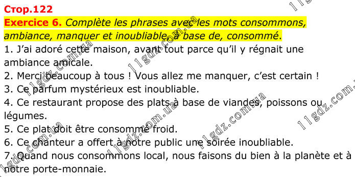 Exercice 6. Complète les phrases avec les mots consommons, ambiance, manquer et inoubliable, à base de, consommé. 1. J’ai adoré cette maison, avant tout parce qu’il y régnait une ambiance amicale. 2. Merci beaucoup à tous ! Vous allez me manquer, c’est certain ! 3. Ce parfum mystérieux est inoubliable. 4. Ce restaurant propose des plats à base de viandes, poissons ou légumes. 5. Ce plat doit être consommé froid. 6. Ce chanteur a offert à notre public une soirée inoubliable. 7. Quand nous consommons local, nous faisons du bien à la planète et à notre porte-monnaie.