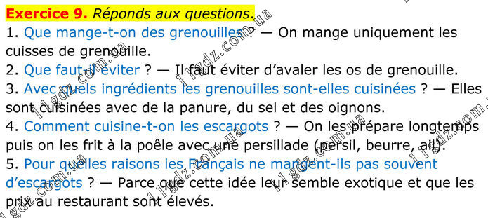 Exercice 9. Réponds aux questions. 1. Que mange-t-on des grenouilles ? — On mange uniquement les cuisses de grenouille. 2. Que faut-il éviter ? — Il faut éviter d’avaler les os de grenouille. 3. Avec quels ingrédients les grenouilles sont-elles cuisinées ? — Elles sont cuisinées avec de la panure, du sel et des oignons. 4. Comment cuisine-t-on les escargots ? — On les prépare longtemps puis on les frit à la poêle avec une persillade (persil, beurre, ail). 5. Pour quelles raisons les Français ne mangent-ils pas souvent d’escargots ? — Parce que cette idée leur semble exotique et que les prix au restaurant sont élevés.