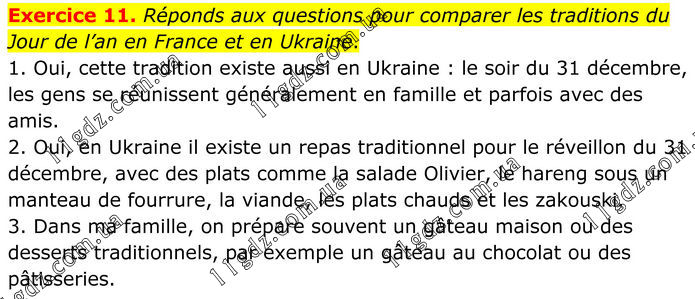 Exercice 11. Réponds aux questions pour comparer les traditions du Jour de l’an en France et en Ukraine. 1. Oui, cette tradition existe aussi en Ukraine : le soir du 31 décembre, les gens se réunissent généralement en famille et parfois avec des amis. 2. Oui, en Ukraine il existe un repas traditionnel pour le réveillon du 31 décembre, avec des plats comme la salade Olivier, le hareng sous un manteau de fourrure, la viande, les plats chauds et les zakouski. 3. Dans ma famille, on prépare souvent un gâteau maison ou des desserts traditionnels, par exemple un gâteau au chocolat ou des pâtisseries.