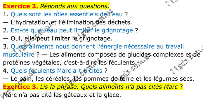 Exercice 2. Réponds aux questions. 1. Quels sont les rôles essentiels de l’eau ? — L’hydratation et l’élimination des déchets. 2. Est-ce que l’eau peut limiter le grignotage ? — Oui, elle peut limiter le grignotage. 3. Quels aliments nous donnent l’énergie nécessaire au travail musculaire ? — Les aliments composés de glucides complexes et de protéines végétales, c’est-à-dire les féculents. 4. Quels féculents Marc a-t-il cités ? — Le pain, les céréales, les pommes de terre et les légumes secs. Exercice 3. Lis la phrase. Quels aliments n’a pas cités Marc ? Marc n’a pas cité les gâteaux et la glace.