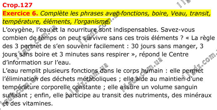 Exercice 6. Complète les phrases avec fonctions, boire, Veau, transit, température, éléments, l’organisme. L’oxygène, l’eau et la nourriture sont indispensables. Savez-vous combien de temps on peut survivre sans ces trois éléments ? « La règle des 3 permet de s’en souvenir facilement : 30 jours sans manger, 3 jours sans boire et 3 minutes sans respirer », répond le Centre d’information sur l’eau. L’eau remplit plusieurs fonctions dans le corps humain : elle permet l’élimination des déchets métaboliques ; elle aide au maintien d’une température corporelle constante ; elle assure un volume sanguin suffisant ; enfin, elle participe au transit des nutriments, des minéraux et des vitamines.