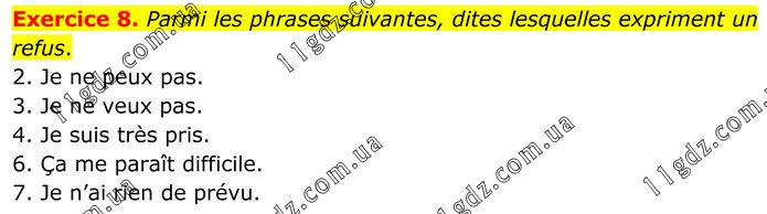 Exercice 8. Parmi les phrases suivantes, dites lesquelles expriment un refus. 2. Je ne peux pas. 3. Je ne veux pas. 4. Je suis très pris. 6. Ça me paraît difficile. 7. Je n’ai rien de prévu.