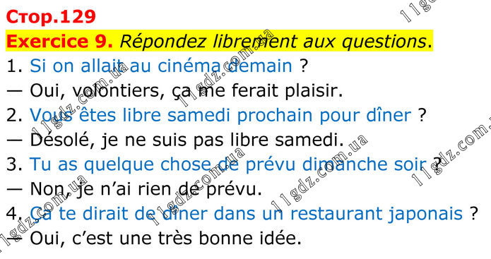 Exercice 9. Répondez librement aux questions. 1. Si on allait au cinéma demain ? — Oui, volontiers, ça me ferait plaisir. 2. Vous êtes libre samedi prochain pour dîner ? — Désolé, je ne suis pas libre samedi. 3. Tu as quelque chose de prévu dimanche soir ? — Non, je n’ai rien de prévu. 4. Ça te dirait de dîner dans un restaurant japonais ? — Oui, c’est une très bonne idée.