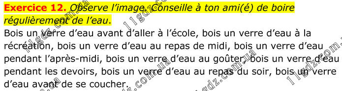 Exercice 12. Observe l’image. Conseille à ton ami(é) de boire régulièrement de l’eau. Bois un verre d’eau avant d’aller à l’école, bois un verre d’eau à la récréation, bois un verre d’eau au repas de midi, bois un verre d’eau pendant l’après-midi, bois un verre d’eau au goûter, bois un verre d’eau pendant les devoirs, bois un verre d’eau au repas du soir, bois un verre d’eau avant de se coucher.