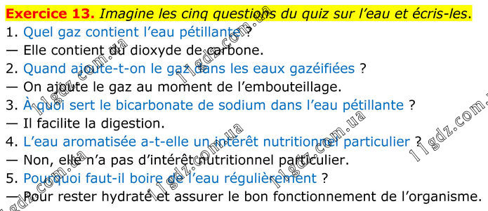 Exercice 13. Imagine les cinq questions du quiz sur l’eau et écris-les. 1. Quel gaz contient l’eau pétillante ? — Elle contient du dioxyde de carbone. 2. Quand ajoute-t-on le gaz dans les eaux gazéifiées ? — On ajoute le gaz au moment de l’embouteillage. 3. À quoi sert le bicarbonate de sodium dans l’eau pétillante ? — Il facilite la digestion. 4. L’eau aromatisée a-t-elle un intérêt nutritionnel particulier ? — Non, elle n’a pas d’intérêt nutritionnel particulier. 5. Pourquoi faut-il boire de l’eau régulièrement ? — Pour rester hydraté et assurer le bon fonctionnement de l’organisme.