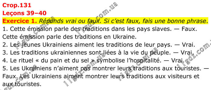 Leçons 39–40 Exercice 1. Réponds vrai ou faux. Si c’est faux, fais une bonne phrase. 1. Cette émission parle des traditions dans les pays slaves. — Faux. Cette émission parle des traditions en Ukraine. 2. Les jeunes Ukrainiens aiment les traditions de leur pays. — Vrai. 3. Les traditions ukrainiennes sont liées à la vie du peuple. — Vrai. 4. Le rituel « du pain et du sel » symbolise l’hospitalité. — Vrai. 5. Les Ukrainiens n’aiment pas montrer leurs traditions aux touristes. — Faux. Les Ukrainiens aiment montrer leurs traditions aux visiteurs et aux touristes.