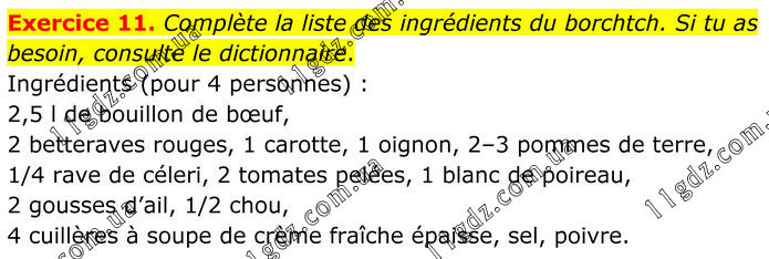 Exercice 11. Complète la liste des ingrédients du borchtch. Si tu as besoin, consulte le dictionnaire. Ingrédients (pour 4 personnes) : 2,5 l de bouillon de bœuf, 2 betteraves rouges, 1 carotte, 1 oignon, 2–3 pommes de terre, 1/4 rave de céleri, 2 tomates pelées, 1 blanc de poireau, 2 gousses d’ail, 1/2 chou, 4 cuillères à soupe de crème fraîche épaisse, sel, poivre.