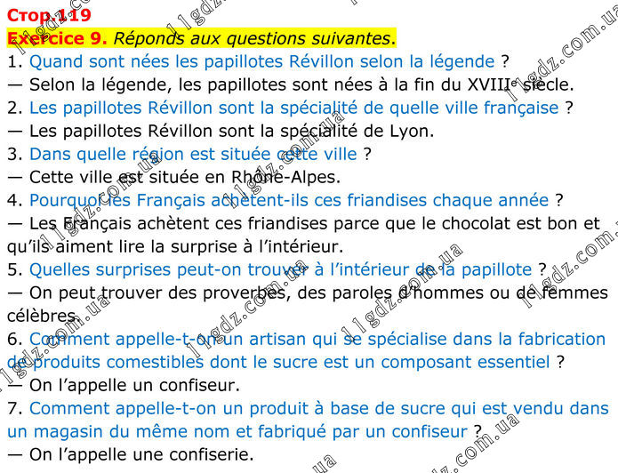 Exercice 9. Réponds aux questions suivantes. 1. Quand sont nées les papillotes Révillon selon la légende ? — Selon la légende, les papillotes sont nées à la fin du XVIIIᵉ siècle. 2. Les papillotes Révillon sont la spécialité de quelle ville française ? — Les papillotes Révillon sont la spécialité de Lyon. 3. Dans quelle région est située cette ville ? — Cette ville est située en Rhône-Alpes. 4. Pourquoi les Français achètent-ils ces friandises chaque année ? — Les Français achètent ces friandises parce que le chocolat est bon et qu’ils aiment lire la surprise à l’intérieur. 5. Quelles surprises peut-on trouver à l’intérieur de la papillote ? — On peut trouver des proverbes, des paroles d’hommes ou de femmes célèbres. 6. Comment appelle-t-on un artisan qui se spécialise dans la fabrication de produits comestibles dont le sucre est un composant essentiel ? — On l’appelle un confiseur. 7. Comment appelle-t-on un produit à base de sucre qui est vendu dans un magasin du même nom et fabriqué par un confiseur ? — On l’appelle une confiserie.