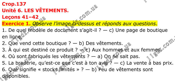 Unité 6. LES VÊTEMENTS. Leçons 41–42 Exercice 1. Observe l’image ci-dessus et réponds aux questions. 1. De quel modèle de document s’agit-il ? — c) Une page de boutique en ligne. 2. Que vend cette boutique ? — b) Des vêtements. 3. À qui est destiné ce produit ? — c) Aux hommes et aux femmes. 4. Où sont fabriqués les vêtements ? — a) On ne sait pas. 5. La braderie, qu’est-ce que c’est à ton avis ? — c) La vente à bas prix. 6. Que signifie « stocks limités » ? — b) Peu de vêtements sont disponibles.