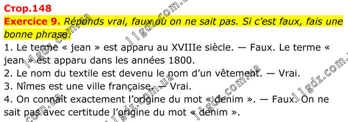 Exercice 9. Réponds vrai, faux ou on ne sait pas. Si c’est faux, fais une bonne phrase. 1. Le terme « jean » est apparu au XVIIIe siècle. — Faux. Le terme « jean » est apparu dans les années 1800. 2. Le nom du textile est devenu le nom d’un vêtement. — Vrai. 3. Nîmes est une ville française. — Vrai. 4. On connaît exactement l’origine du mot « denim ». — Faux. On ne sait pas avec certitude l’origine du mot « denim ».