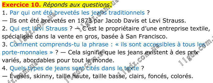 Exercice 10. Réponds aux questions. 1. Par qui ont été brevetés les jeans traditionnels ? — Ils ont été brevetés en 1873 par Jacob Davis et Levi Strauss. 2. Qui est Levi Strauss ? — C’est le propriétaire d’une entreprise textile, spécialisée dans la vente en gros, basée à San Francisco. 3. Comment comprends-tu la phrase : « ils sont accessibles à tous les porte-monnaies » ? — Cela signifie que les jeans existent à des prix variés, abordables pour tout le monde. 4. Quels types de jeans sont cités dans le texte ? — Évasés, skinny, taille haute, taille basse, clairs, foncés, colorés.