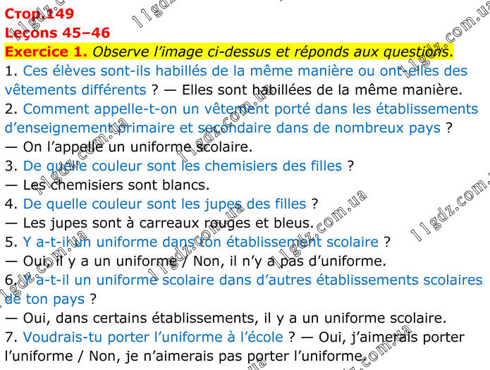 Leçons 45–46 Exercice 1. Observe l’image ci-dessus et réponds aux questions. 1. Ces élèves sont-ils habillés de la même manière ou ont-elles des vêtements différents ? — Elles sont habillées de la même manière. 2. Comment appelle-t-on un vêtement porté dans les établissements d’enseignement primaire et secondaire dans de nombreux pays ? — On l’appelle un uniforme scolaire. 3. De quelle couleur sont les chemisiers des filles ? — Les chemisiers sont blancs. 4. De quelle couleur sont les jupes des filles ? — Les jupes sont à carreaux rouges et bleus. 5. Y a-t-il un uniforme dans ton établissement scolaire ? — Oui, il y a un uniforme / Non, il n’y a pas d’uniforme. 6. Y a-t-il un uniforme scolaire dans d’autres établissements scolaires de ton pays ? — Oui, dans certains établissements, il y a un uniforme scolaire. 7. Voudrais-tu porter l’uniforme à l’école ? — Oui, j’aimerais porter l’uniforme / Non, je n’aimerais pas porter l’uniforme.